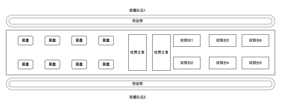 程序裏的超時好加,因為程序沒有喜怒哀樂,但打餐的場景不一樣,總不能在每個菜後面安排一個服務員在背後數123計時,超過5s往前推他一把,總不能這樣吧,究其原因就是打菜是主觀能動的,他想在一個菜前停多久就停多久,想到這個問題後,我有了主意,把用户自主停留的權利給剝奪,創造統一的停留時間,所以我給華哥設計了一套超時裝置,那就是在餐枱的兩邊各增加一套自動傳送裝置,類似於飛機場裏安檢後趕去航站樓的傳送帶一樣,這樣人們在兩邊打菜時不需要自己走動了,而且每個人在每個菜盤前停留時間是一樣的,就不會出現一個人在某個菜前停留時間過久的問題,也避免了餐枱因前面某個人的長時間停留而出現整體停滯的問題,提升了餐枱的吞吐量,而且傳送帶的增加還有個好處就是人不多時可以開得很慢甚至停掉,在高峯期時可以適當增加傳送帶的速度,從而控制每一個人打菜的時間,保障整個餐枱的吞吐率。