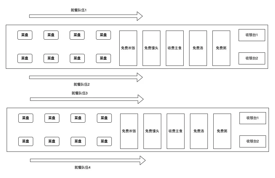 套用這兩個理論,看看怎麼提升餐枱的吞吐,好像垂直擴容這塊能做的不多,總不能把打飯的勺子升級一下變成德國原裝進口高温武火蹴練鍍金勺吧;不過雖然垂直擴容沒什麼好辦法, 但是水平擴容好像能做的事情很多了,只要多增加幾套打菜餐枱,這樣並行執行的2條打飯隊伍就可以變成4條,甚至8條,直接實現了多線程併發,這樣系統整體的吞吐能力可以立馬獲得翻倍式提升,效果不但見效塊,效果也可謂是立竿見影,於是我給畫了一個水平擴容示意圖,如下圖所示:
