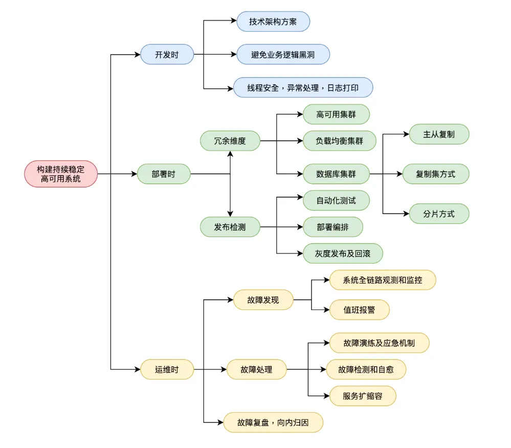 在京東618備戰期間,系統的高可用對我們來説至關重要,因為系統的崩潰,不止帶來直接經濟上的損失,還會導致用户信任的丟失。接下來我通過一張思維導圖展開我的分享,幫大家梳理一下一個高可用系統所需要考慮的技術點。
