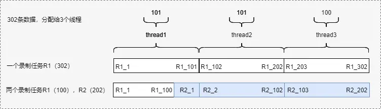 按錄製任務中錄製總量,平均分配到各個線程,餘數再按輪詢方式分配給每個線程,分完為止,這樣可以確定出每個線程分配的記錄條數(窗口大小);