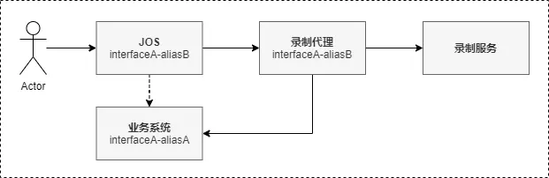外部商家通過HTTP方式調用JOS平台,JOS平台內部轉JSF調用接單服務。為使外部商家無感,發佈一個和業務系統接口完全相同的JSF服務(虛服務),不同的是提供一個新的別名,通過JOS平台配置切換到新的別名,這樣就把JOS流量引入到了錄製代理,然後再由錄製代理通過異步MQ方式將流量上報給錄製服務做持久化存儲。