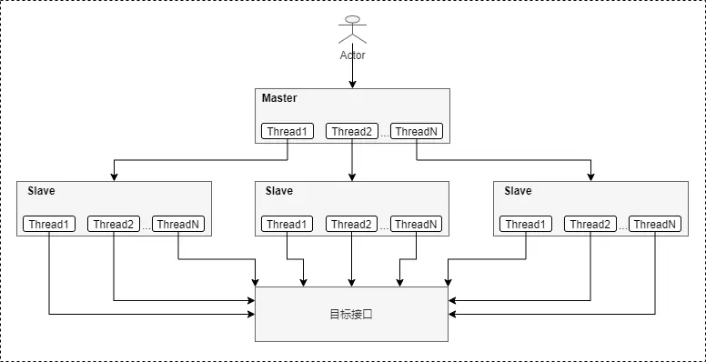 壓測引擎採用主從架構,壓力機分主從節點,主節點負責接收壓測請求並分配壓測任務;從節點負責執行壓測任務。