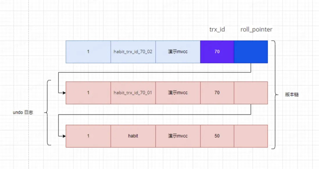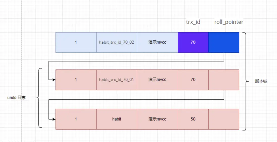 然後從版本鏈中挑選可見的記錄,從圖中可以看出,最新版本的列 name 的內容是 habit\_trx\_id\_70\_02,該版本的 trx\_id 值為 70,在 m\_ids 列表內,所以不符合可見性要求第 4 條:**如果被訪問版本的 trx_id 屬性值在 ReadView 的 min_trx_id 和 max_trx_id之間 min_trx_id < trx_id < max_trx_id,那就需要判斷一下trx_id 屬性值是不是在 m_ids 列表中,如果在,説明創建 ReadView 時生成該版本的事務還是活躍的,該版本不可以被訪問;如果不在,説明創建 ReadView 時生成該版本的事務已經被提交,該版本可以被訪問。**根據 roll_pointer 跳到下一個版本。