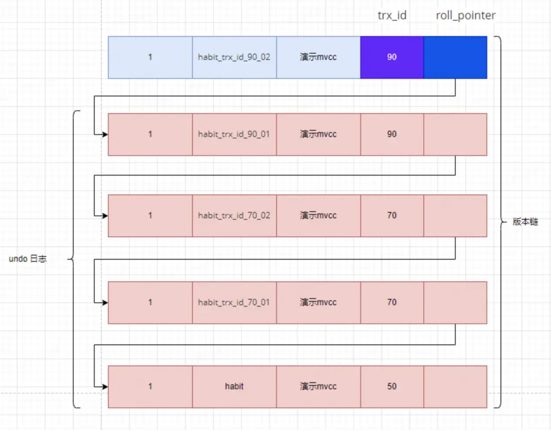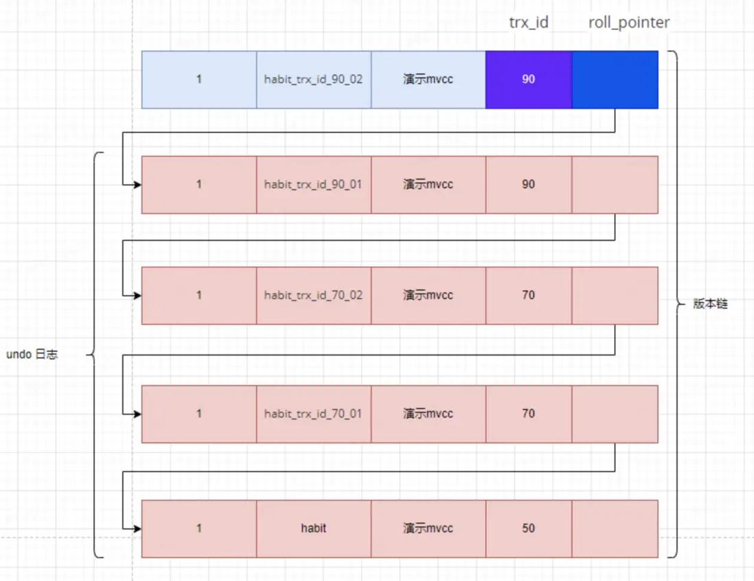 對該記錄每次更新後,都會將舊值放到一條 undo 日誌中,就算是該記錄的一箇舊版本,隨着更新次數的增多,所有的版本都會被 roll_pointer 屬性連接成一個鏈表,把這個鏈表稱之為版本鏈,版本鏈的頭節點就是當前記錄最新的值。另外,每個版本中還包含生成該版本時對應的事務 id。於是可以利用這個記錄的版本鏈來控制併發事務訪問相同記錄的行為,那麼這種機制就被稱之為:多版本併發控制,即 MVCC。