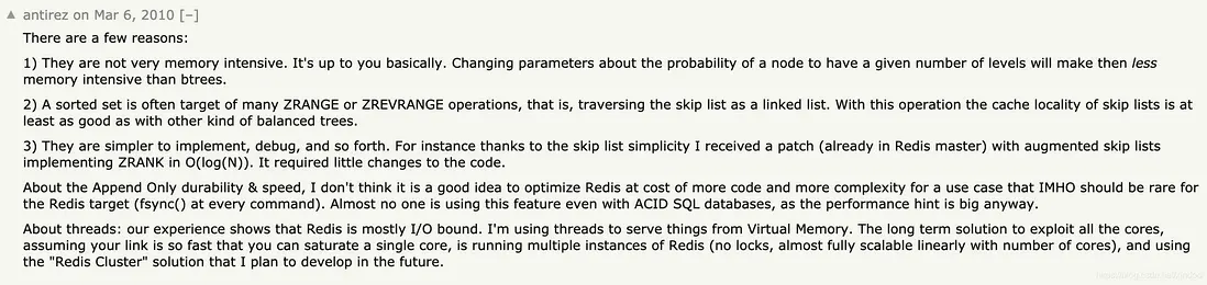 skiplist是為了實現sorted set相關功能,紅黑樹也能實現,並且sorted set會存儲更多的冗餘數據。Redis作者antirez曾回答過這個問題,原文見https://news.ycombinator.com/item?id=1171423