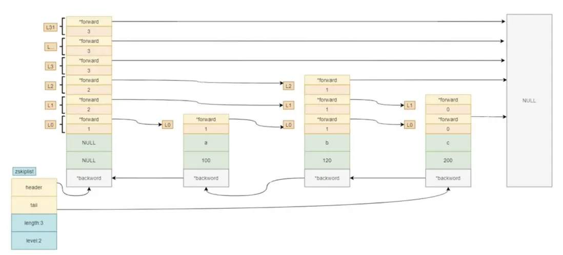 typedef struct zskiplist {// 頭、尾節點;頭節點不存儲元素,擁有最高層高struct zskiplistNode *header, *tail;unsigned long length;// 層級,所有節點中的最高層高int level;} zskiplist;typedef struct zskiplistNode {// 元素member值sds ele;// 分值double score;// 後退指針struct zskiplistNode *backward;// 節點中用 L1、L2、L3 等字樣標記節點的各個層, L1代表第一層, L2代表第二層,以此類推。struct zskiplistLevel {// 指向本層下一個節點,尾節點指向nullstruct zskiplistNode *forward;// *forward指向的節點與本節點之間的元素個數,span值越大,跳過的節點個數越多unsigned long span;} level[];} zskiplistNode;