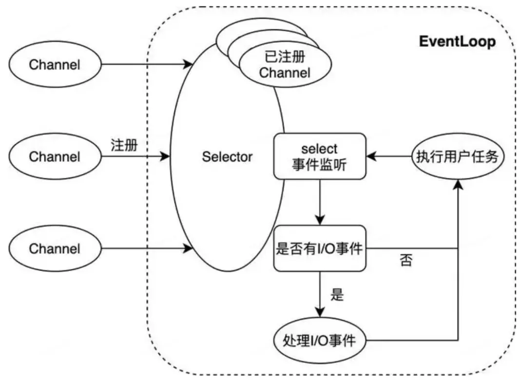 上圖展示了Netty NIO的核心邏輯。NIO通常被理解為non-blocking I/O的縮寫,表示非阻塞I/O操作。圖中Channel表示一個連接通道,用於承載連接管理及讀寫操作;EventLoop則是事件處理的核心抽象。一個EventLoop可以服務於多個Channel,但它只會與單一線程綁定。EventLoop中所有I/O事件和用户任務的處理都在該線程上進行;其中除了選擇器Selector的事件監聽動作外,對連接通道的讀寫操作均以非阻塞的方式進行 —— 這是NIO與BIO(blocking I/O,即阻塞式I/O)的重要區別,也是NIO模式性能優異的原因。