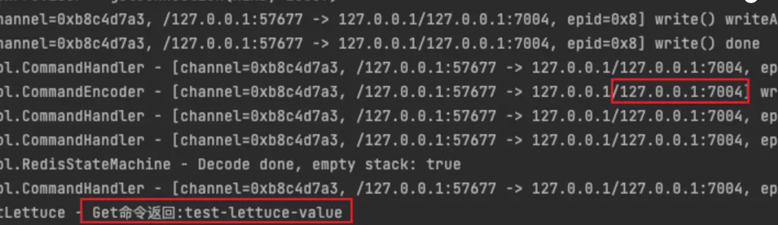 可以看到成功地獲取到了值,由日誌可以看出該請求發送到了7004所在的節點上,順利拿到了對應的值並進行返回。