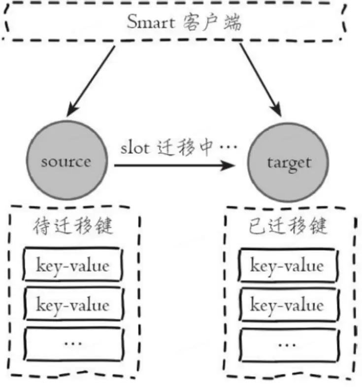 Redis集羣支持在線遷移槽(slot)和數據來完成水平伸縮,當slot對應的數據從源節點到目標節點遷移過程中,客户端需要做到智能識別,保證鍵命令可正常執行。例如當一個slot數據從源節點遷移到目標節點時,期間可能出現一部分數據在源節點,而另一部分在目標節點,如下圖所示