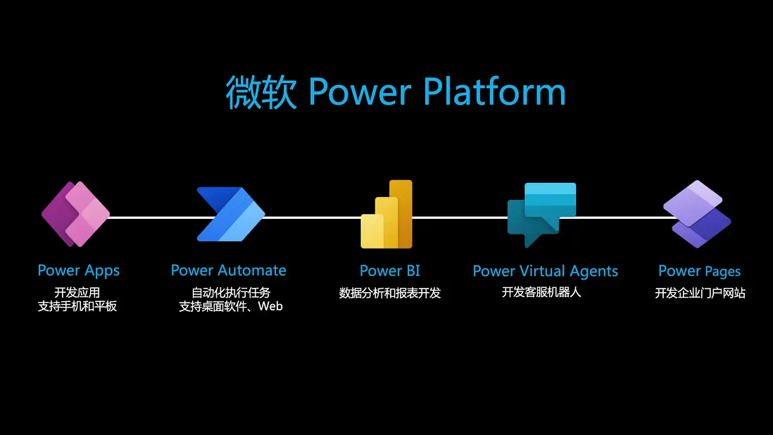 Power Platform 的產品理念是讓沒有技術背景的人、開發者都能輕鬆高效的解決業務問題。產品架構上以 Dataverse 為核心,內置數據模型(Common Data Model)降低業務建模成本,可視化的 UI 編輯器(Power Apps、Power Pages)可降低應用開發成本,報表製作工具(Power BI)可挖掘出數據的價值,效率工具(Power Automate 和 Power Virtual Agents)可將員工從枯燥重複的任務中解放出來,這一整套組合拳下來,期望幫助企業更好的發展業務,節省運營成本