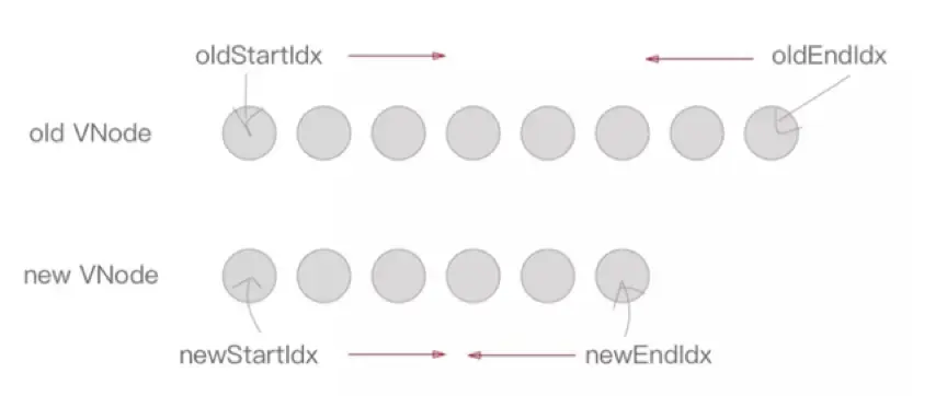 (4)咱們終於來到了主角updateChildren。在updateChildren內部實現中,使用了2套指針分別指向新舊Vnode頭尾,並向中間聚攏遞歸,以實現新舊數據對比刷新。