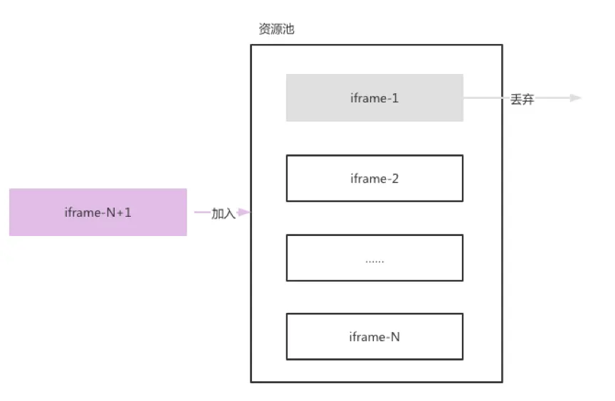 引入一個容量為N的Iframe資源池來管理多開窗口,當資源池未滿時,新激活的窗口可以直接插入至資源池中;當資源池已滿時,資源池按照競爭策略,淘汰若干池中的窗口並丟棄,然後插入新激活的窗口至資源池中。通過調整容量N,可以限制父應用主頁面上多開窗口的數量,從而限制併發請求數量,實現資源管控的目的。