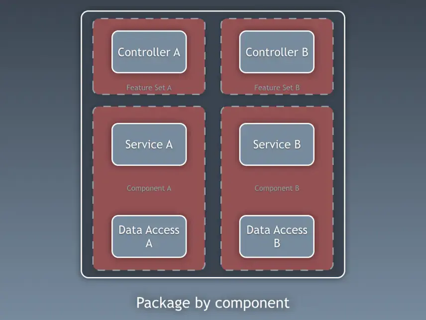 我是“按組件分包”方式的堅定擁護者,在此我厚着臉皮將 Simon Brown 按組件分包的示意圖做了如下修改: