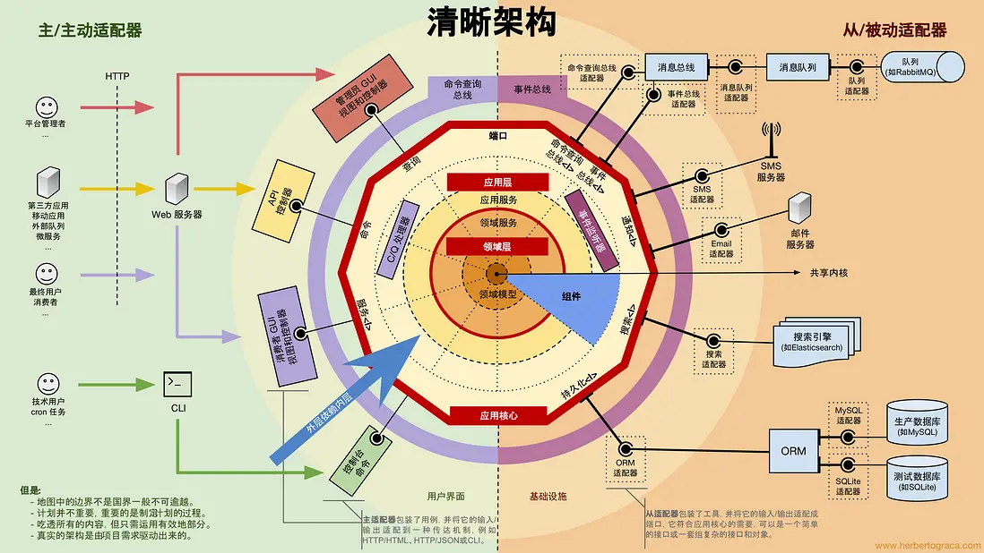 - 從外向內,越向內越偏核心原則,核心原則相對穩定。核心原則就是常規的領域層,提供核心能力