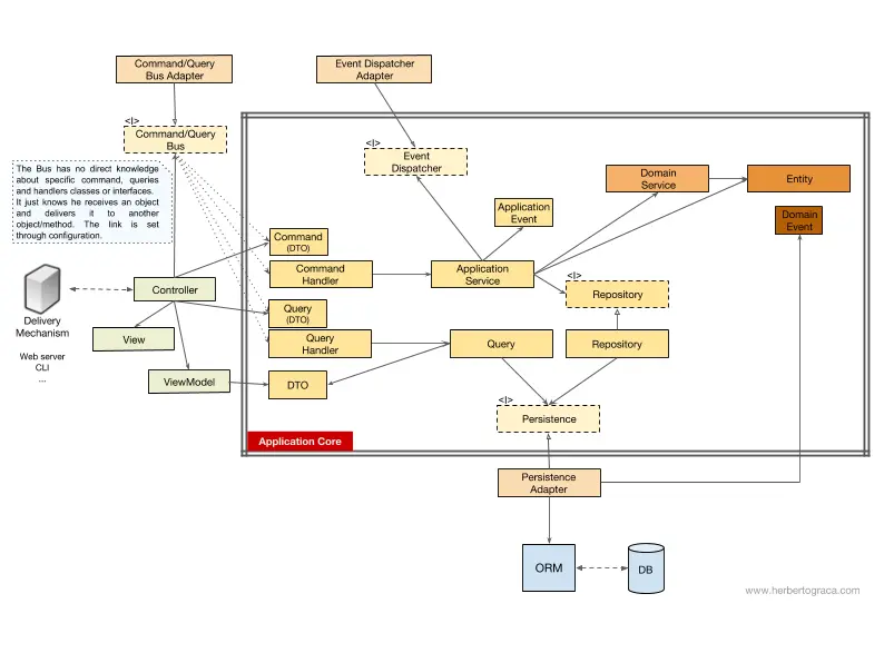 這個層包括了應用服務(以及它們的接口),也包括了端口與適配器架構中的接口,例如 ORM 接口、搜索引擎接口、消息接口等等。如果我們使用了命令總線和查詢總線,命令和查詢分別對應的處理程序也屬於這一層。