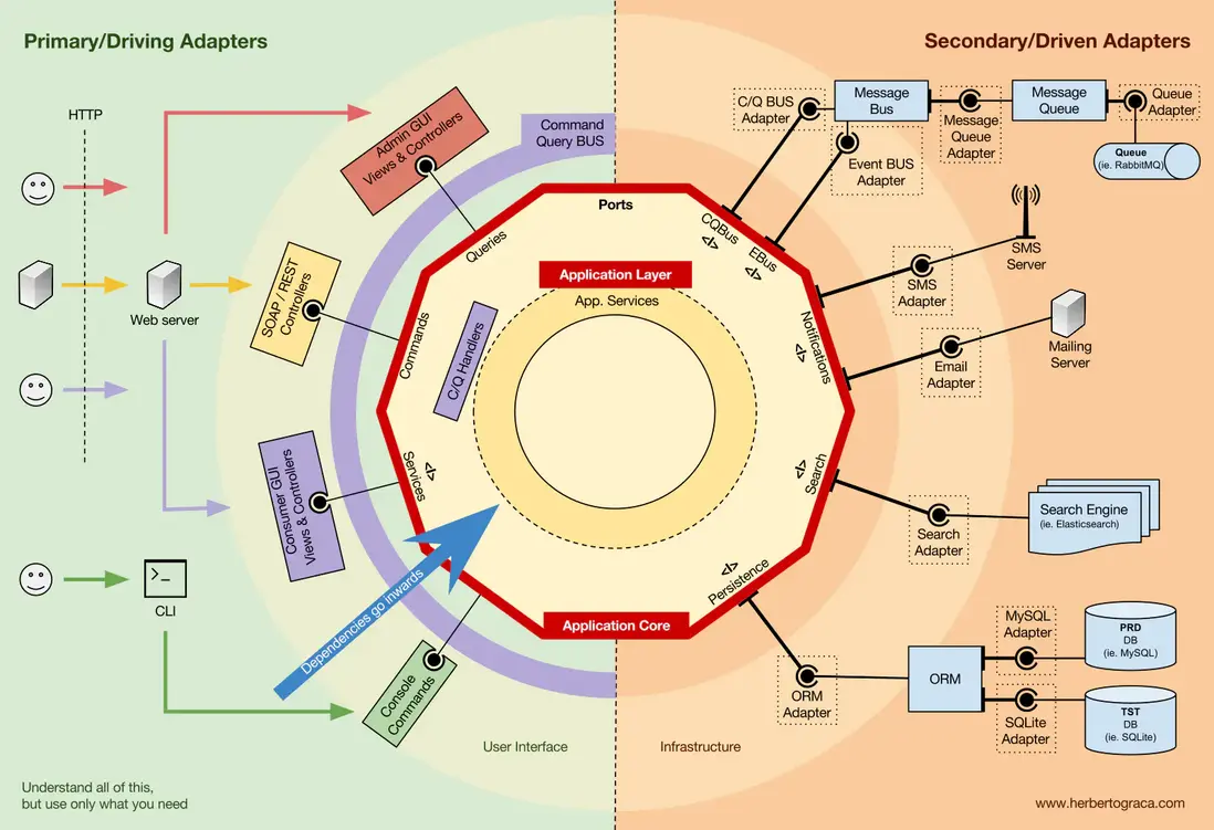 再舉一個更具體的例子,端口就是 Controller 需要的 Service 接口或者 Repository 接口。Service、Repository 或 Query 的具體實現被注入到 Controller 供 Controller 使用。