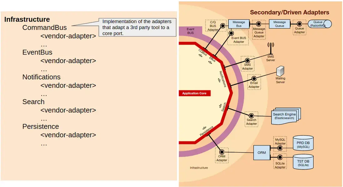 因此,在Infrastructure命名空間來説,我們先給每一種工具類型創建一個命名空間(ORM、MessageQueue、SmsClient),然後再每一種工具類型內部為每一種用到的供應商(Doctrine、Propel、MessageBird、Twilio…)的適配器在創建一個命名空間。