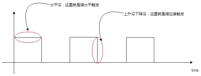 水平觸發,意即Level Trigger,邊緣觸發,意即Edge Trigger,如果單從字面意思上理解,則不太容易,但是如果將硬件設計中的水平沿,上升沿,下降沿的概念引進來,則理解起來就容易多了。比如我們可以這樣認為: