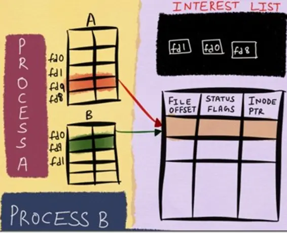 在linux內核中,針對當前打開的文件,有一個open file table,裏面記錄的是所有打開的文件描述符信息;同時也有一個inode table,裏面則記錄的是底層的文件描述符信息。這裏假如文件描述符B fork了文件描述符A,雖然在open file table中,我們看新增了一個文件描述符B,但是實際上,在inode table中,A和B的底層是一模一樣的。這裏,將inode table中的內容理解為windows中的文件屬性,會更加貼切和易懂。這樣存儲的好處就是,無論上層文件描述符怎麼變化,由於epoll監控的數據永遠是inode table的底層數據,那麼我就可以一直能夠監控到文件的各種變化信息,這也是epoll高效的基礎。更多詳細信息,請參閲這兩篇文章:Nonblocking IO & The method to epoll's madness.