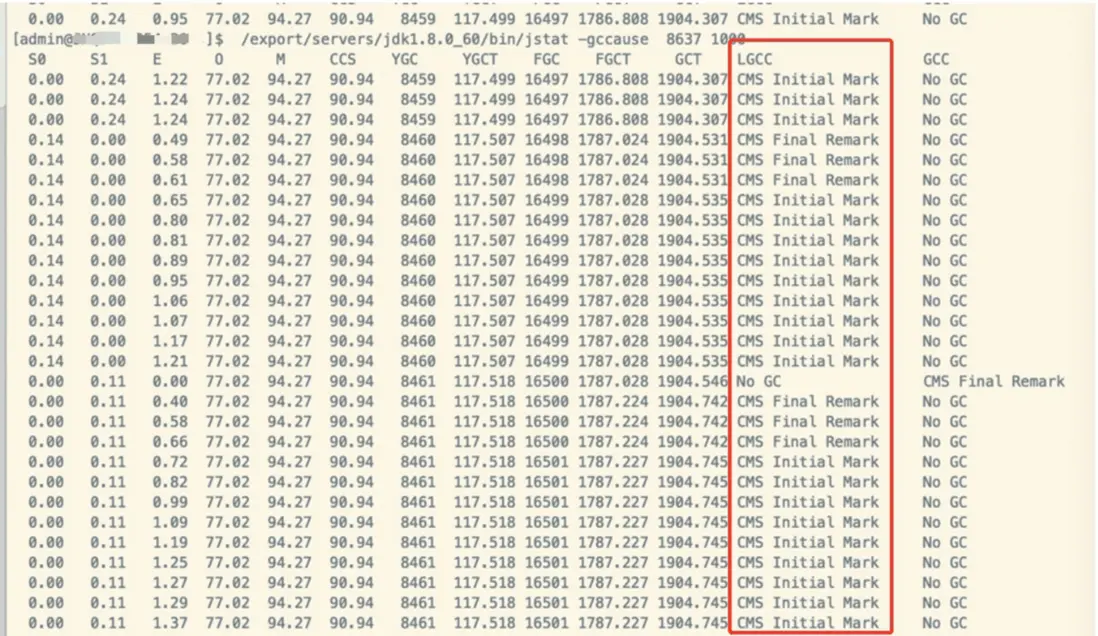 在查詢堆棧前執行GC原因指令:jstat -gccause [pid] 1000,執行結果如下圖,可以看到 LGCC 這一列代表了最後執行 gc 的原因。CMS Initial Mark 和 CMS Final Remark 這兩個階段是 CMS 垃圾回收的初始標記和最終標記階段是耗時最長也是造成 STW(Stop The World)的兩個階段