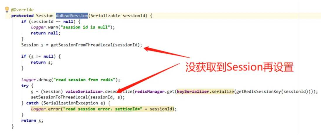 下面的方法主要整合了獲取Session操作和設置Session操作,如果從ThreadLocal中沒有獲取到或者本地緩存超過1秒了就返回null,判斷為null之後就會從redis中獲取並新建一個Session存儲到ThreadLoca中