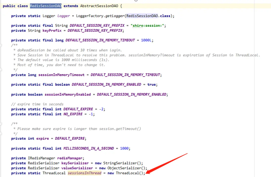 1、在RedisSessionDAO.java文件中定義了一個ThreadLocal變量作為線程隔離