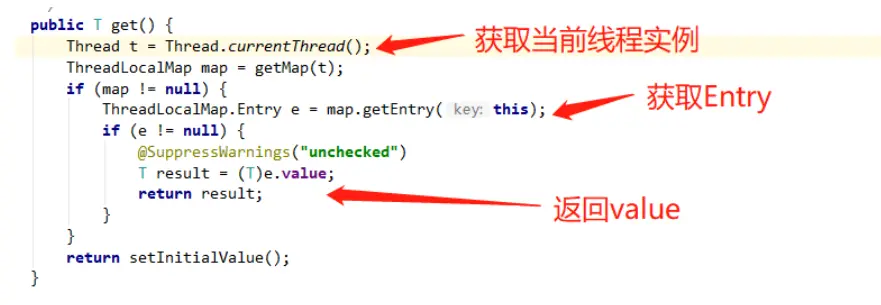 當一個線程需要獲取 Entry 中存儲的 value 時候,調用 sessionsInThread.get()方法,這個方法做了三件事情,一是獲取當前線程的實例,二是從線程實例中獲取 ThreadLocalMap,三是從 ThreadLocalMap 中根據 ThreadLocal 這個 key 獲取指定的 value