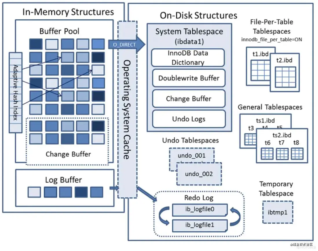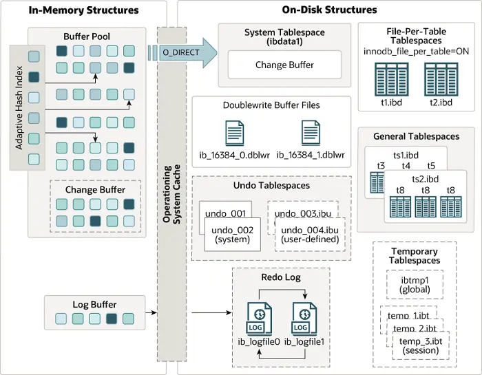 表空間分為系統表空間(ibdata1文件)(共享表空間)、臨時表空間、常規表空間、Undo表空間和file-per-table表空間(獨立表空間)。系統表空間又包括雙寫緩衝區(Doublewrite buffer)、Change Buffer等