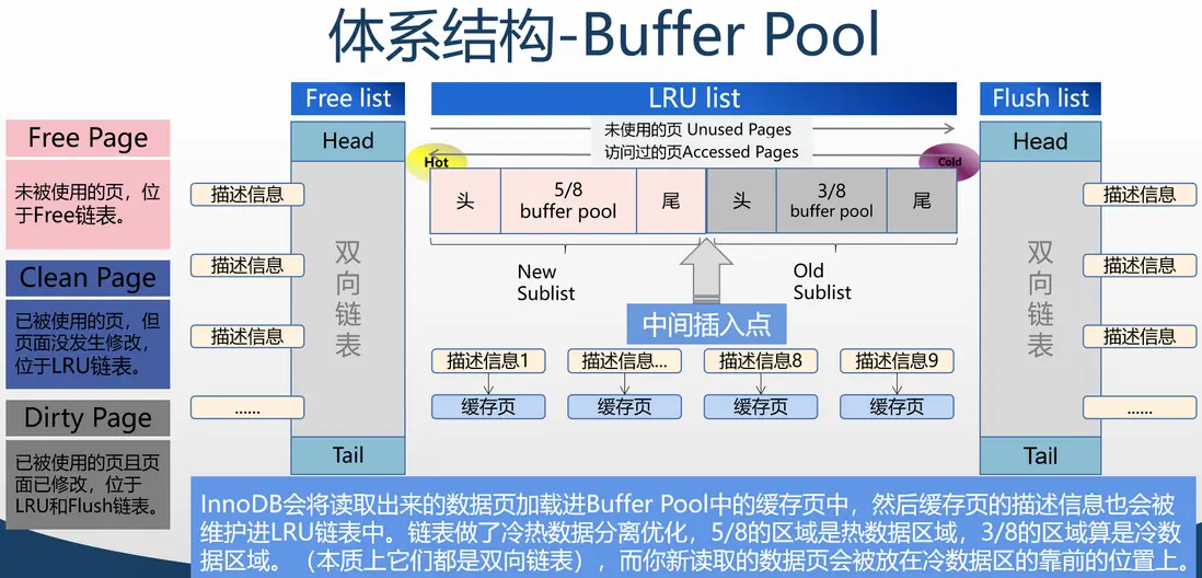 為了緩存管理的效率,緩衝池被實現為頁鏈表,採用三個鏈表維護內存頁,而內存頁也因此對應 3 種狀態: Free 尚未使用; Clean 已使用但未修改; Dirty(髒頁)已修改;Free頁只位於Free List,而Clean和Dirty頁同時位於LRU List,Dirty頁只存在於Flush List;