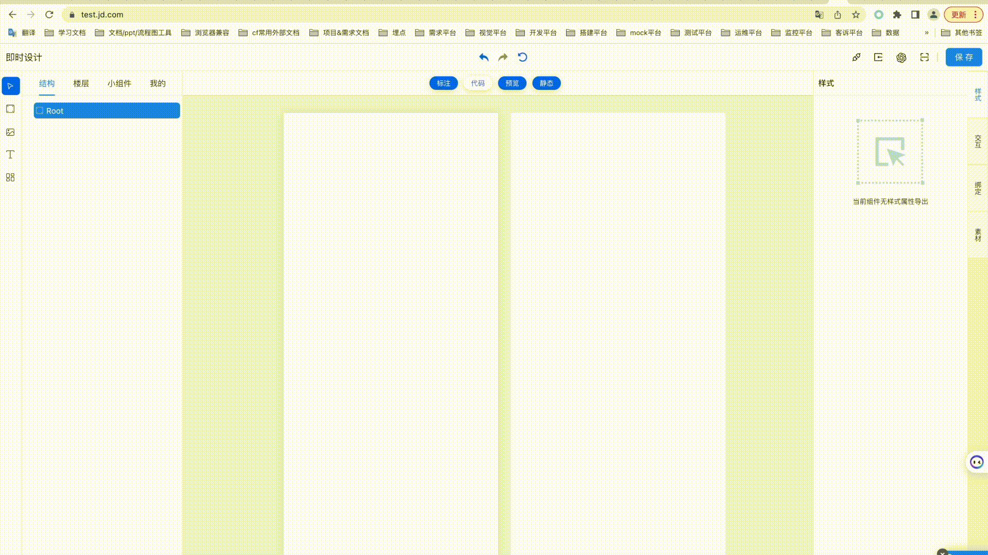 頁面結構主要為上下兩結構,分為頂部菜單區和主體區,其中主題區為四列結構,分別為“選擇和繪製工具”區、“結構、樓層、小組件、我的”水平選項卡標籤頁區、“畫布和預覽”區、“元素的樣式、交互、綁定功能”垂直選項卡標籤頁區。