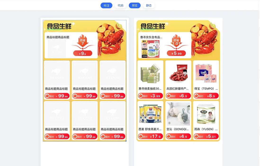 •當靜態功能開啓時,預覽區展示靜態內容數據,即畫布編輯區展示的數據內容;關閉時,預覽區針對已綁定動態數據的內容部分元素,展示綁定的數據,如數據源接口數據、狀態管理數據;