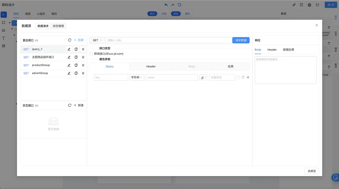 •請求信息,包含請求鏈接、請求前置條件配置、接口類型選項(是否為跨域接口,即非xxx.jd.com 域名)、屬性參數(Query、Header、Body等)信息配置,其中屬性參數支持添加字符串、數字、布爾值、數組、對象類型的數據,支持編輯、從狀態管理選取值、從頁面參數選取值,支持導出到素材分類等功能
