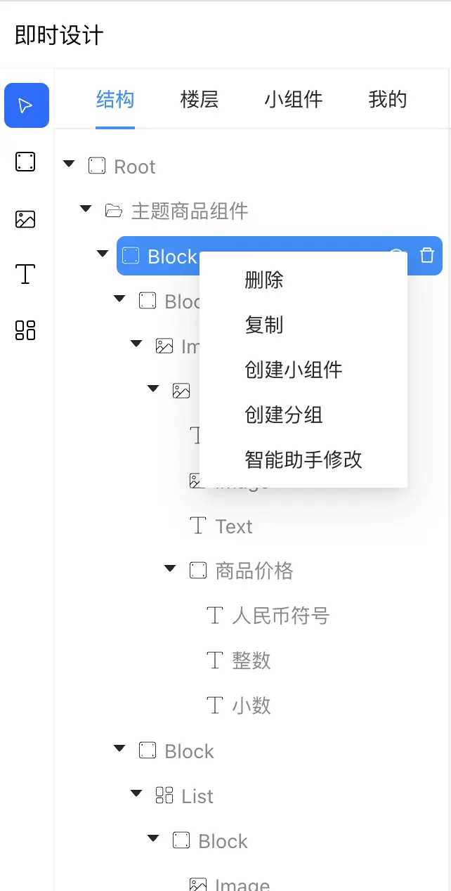 •非Root節點,右鍵節點彈出操作列表,操作列表包含刪除、複製、創建小組件、創建分組、取消分組等功能