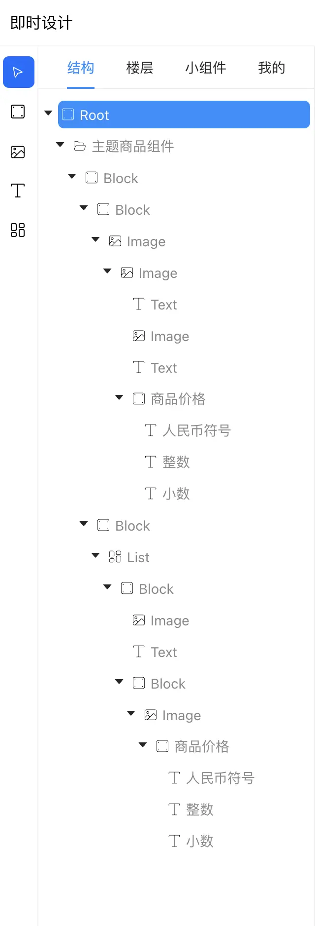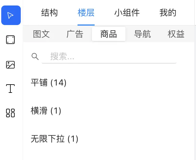 當前區域包含4個水平選項卡標籤頁,分別為“結構”、“樓層”、“小組件”、“我的”。
