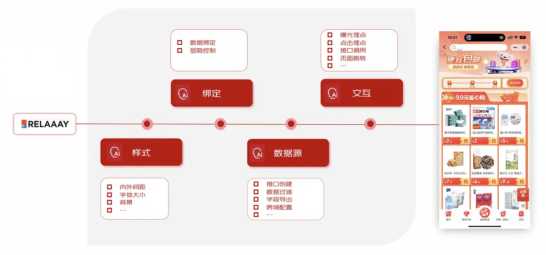 即時設計提供畫布內容類型(block、image、text、list)增加、刪除、層級調整、複製等,樣式配置,數據接口配置、狀態管理配置、內容與數據綁定、點擊交互和曝光交互,Relay設計稿導入轉換成包含樣式的畫布內容,畫布內容的即時預覽,畫布內容的二維碼小程序預覽,代碼查看並支持二次編輯,ChatGPT 自然語言對話操作頁面功能調整等。