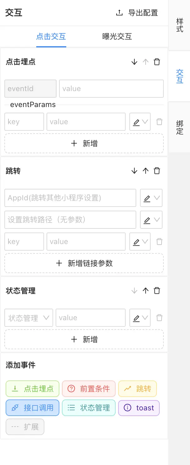 其中點擊交互/曝光交互以水平選項卡形式佈局,點擊交互和曝光交互均支持添加事件,共同可添加的事件有前置條件、跳轉、接口調用、狀態管理、toast、重新渲染,僅點擊交互可添加的事件有點擊埋點,僅曝光交互可添加的事件有曝光埋點。