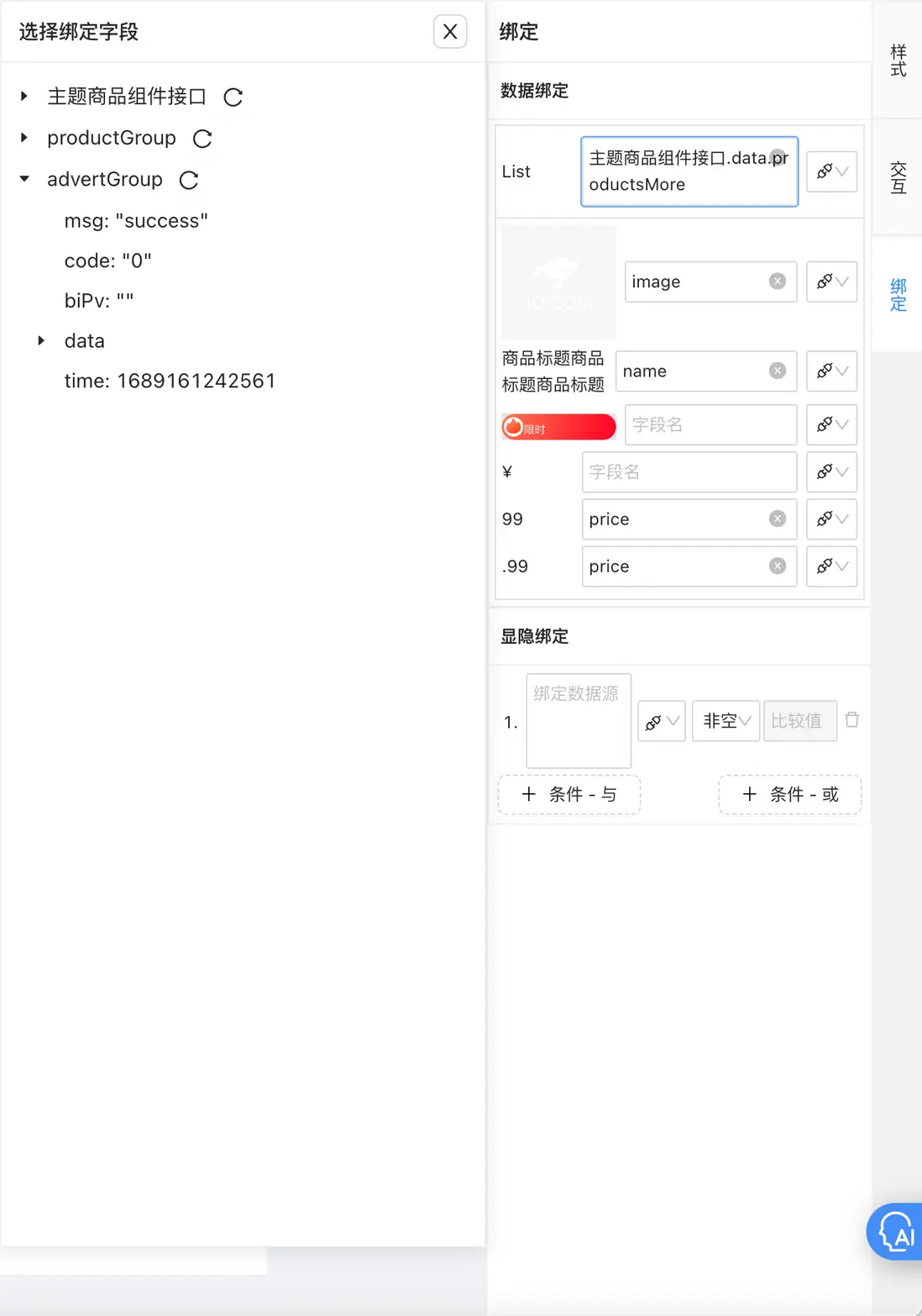 •顯隱綁定:通過添加條件,選取數據源/狀態管理/頁面參數,在樓層被使用並運行時,對所選值與填入的比較值比較,得出該節點元素顯示或隱藏的控制結果;