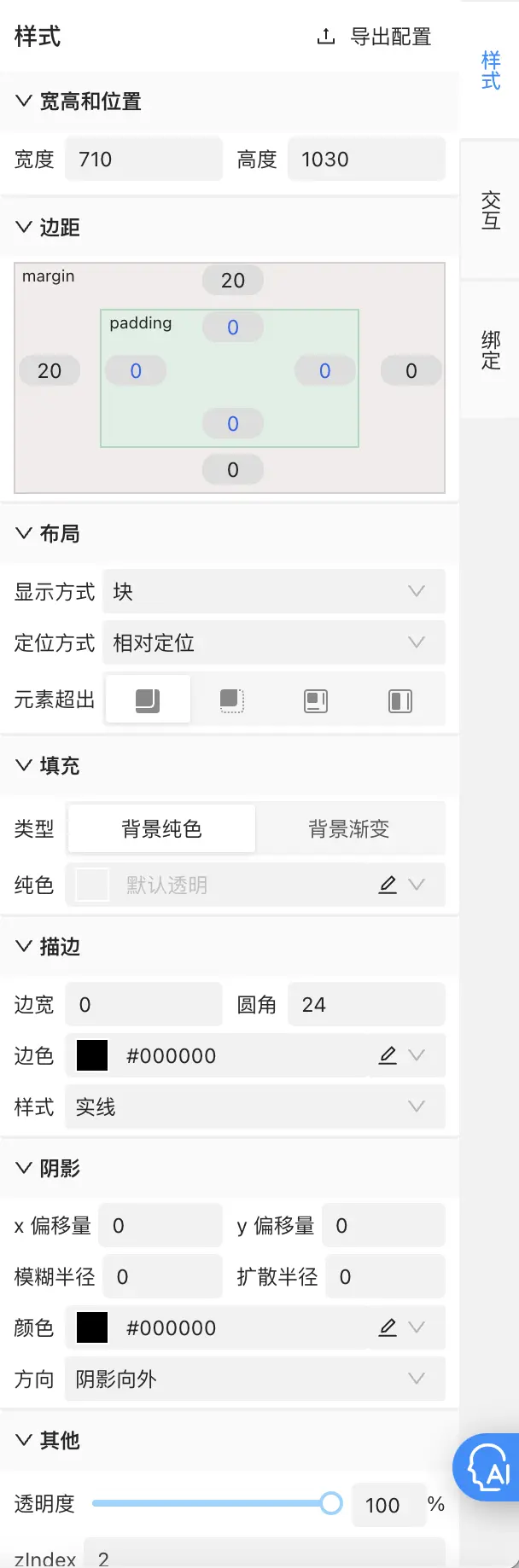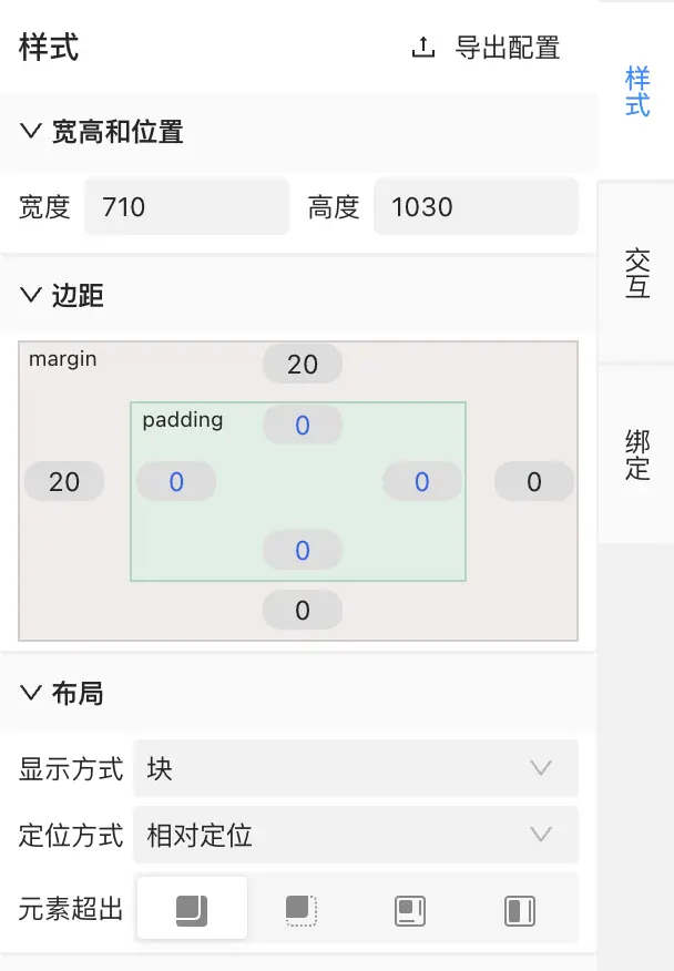 樣式配置區展示選中的節點元素的主要樣式信息的配置列表和導出配置按鈕。