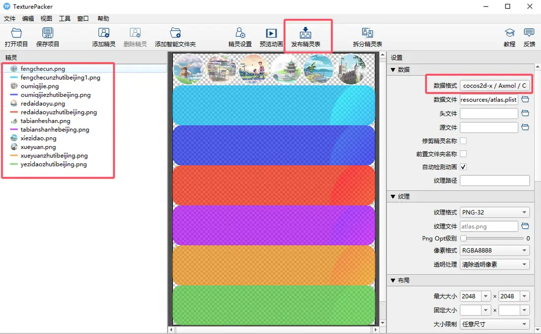 使用方式也比較簡單,將散圖拖進去,修改格式和路徑,然後發佈精靈集即可。