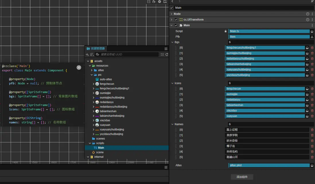 首先綁定一下資源和腳本,包括背景、圖標和名字。