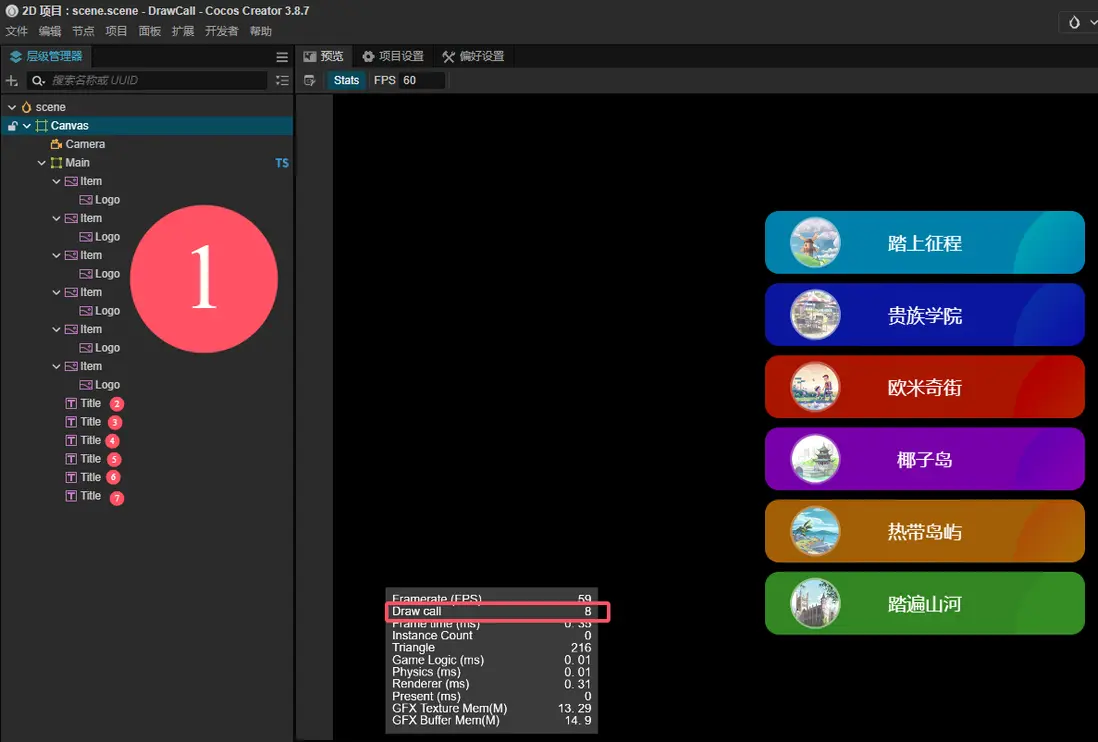 圖集處理好之後運行看下效果,使用圖集之後,DrawCall降低到13個了。