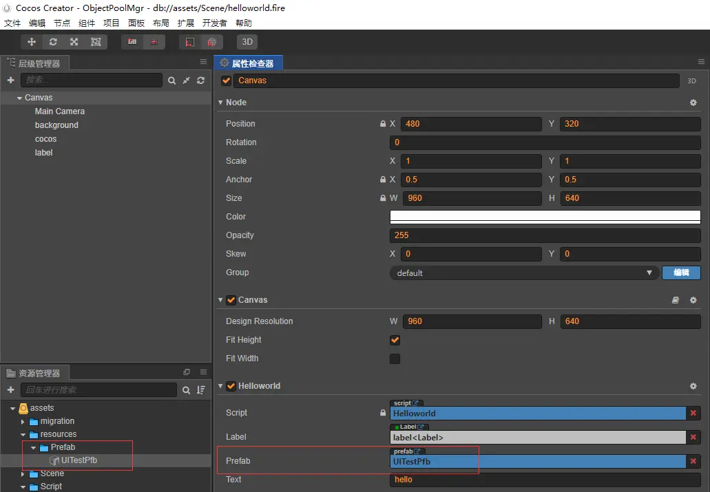 創建測試預製體並且添加到Prefab節點上。