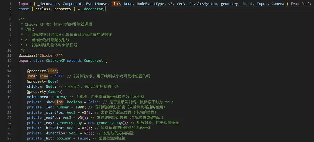 首先聲明一個ChickenKF類並掛在Canvas上,綁定好Line組件、雞科夫和攝像機。