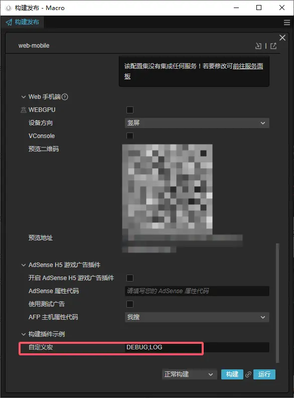 新建web平台,自定義宏中輸入DEBUG;LOG。