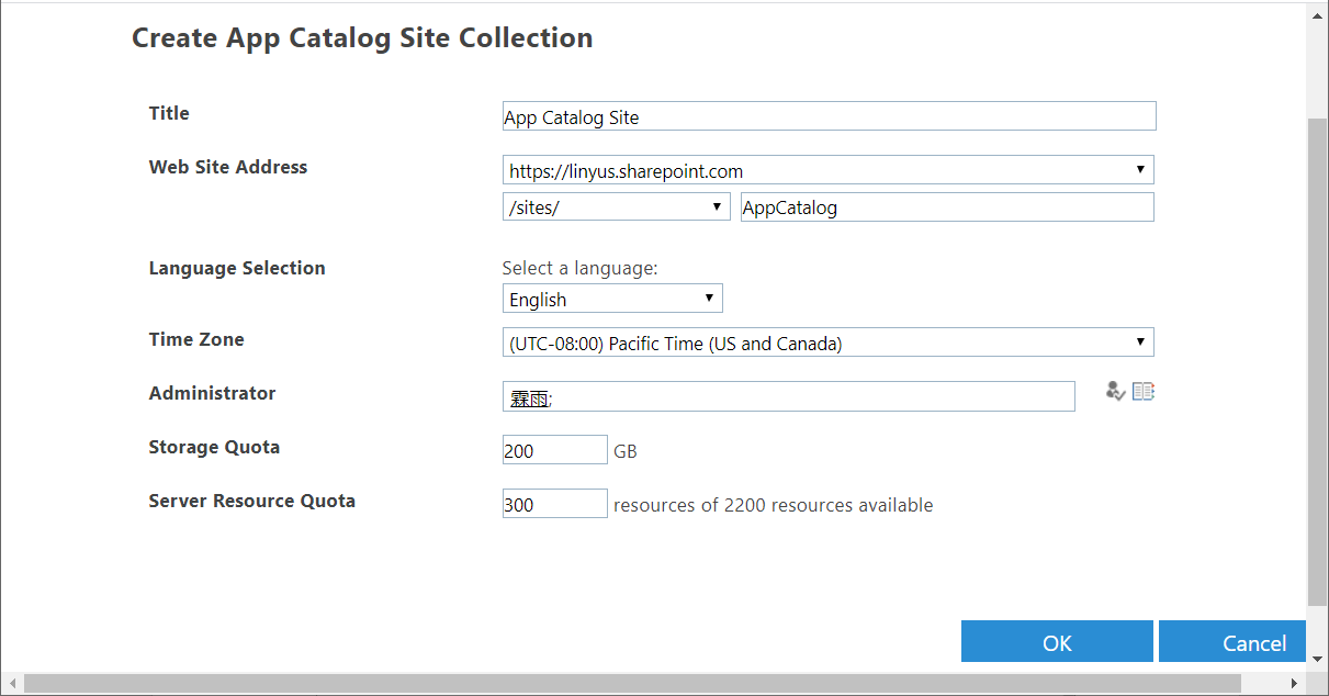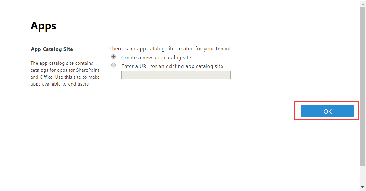 5.點擊OK按鈕,我們可以手動創建App Catalog Site,創建完畢也會自動設置為應用程序目錄。當然,如果我們已經存在應用程序目錄站點,我們可以直接輸入Url設置為App Catalog,如下圖: