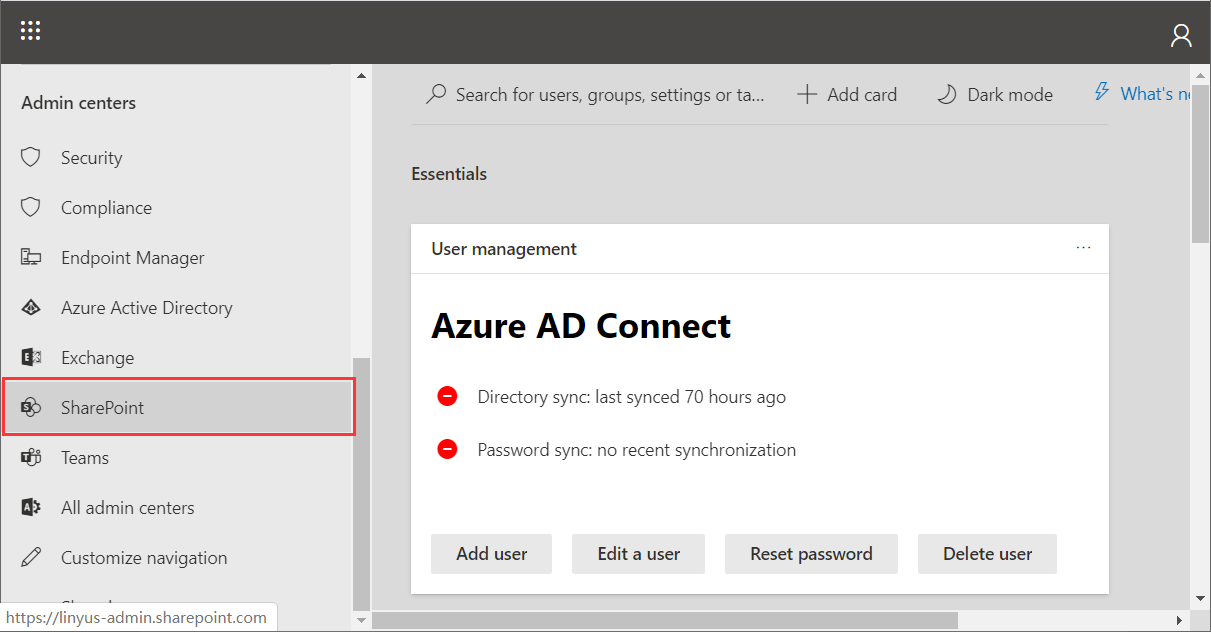 當我們新申請的Office環境,可能並不能在左側導航中看到,因為Office需要在後台幫我們創建SharePoint環境,需要等一段時間才會出現。如果遲遲不能顯示,我們可以嘗試手動敲Url地址訪問https://domain-admin.sharepoint.com