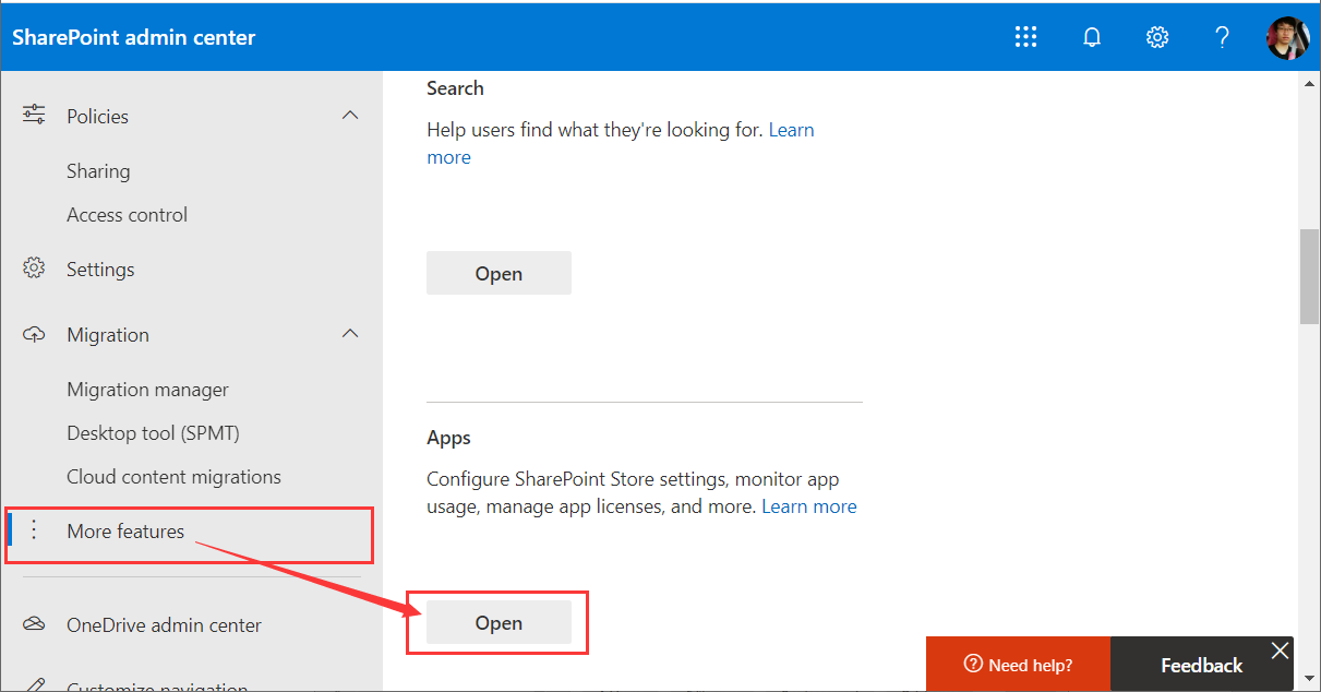 3.在SharePoint Online的管理中心裏,找到More Feature裏面的Apps,點擊Open,如下圖: