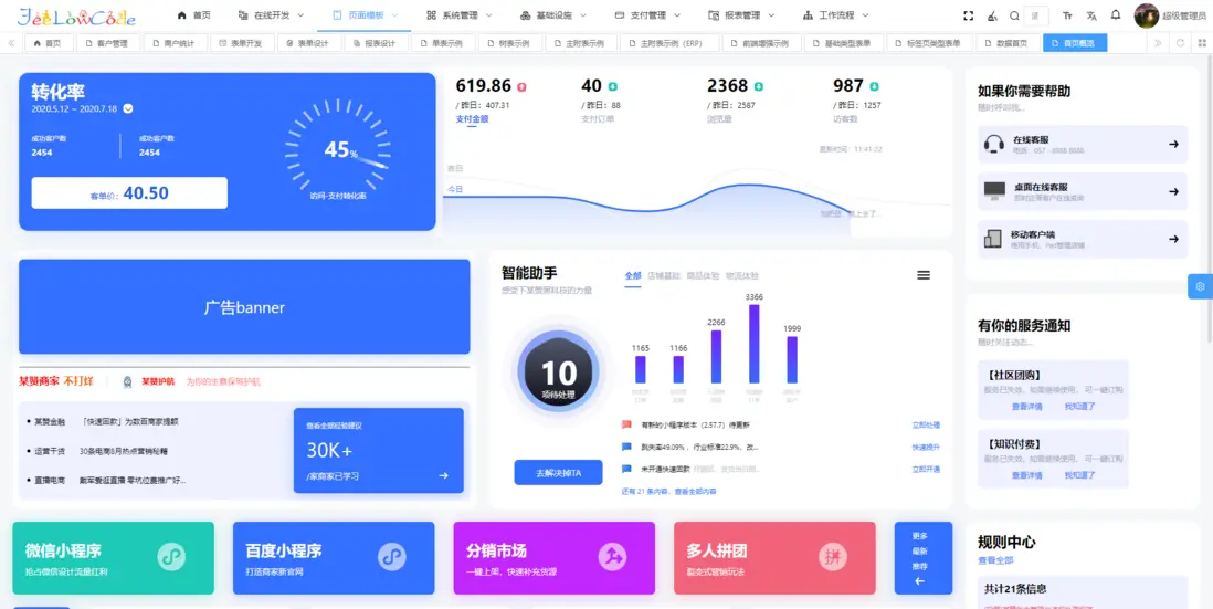 - 多維分析引擎:支持自定義報表和交互式儀表盤,結合可視化組件提供業務洞察。