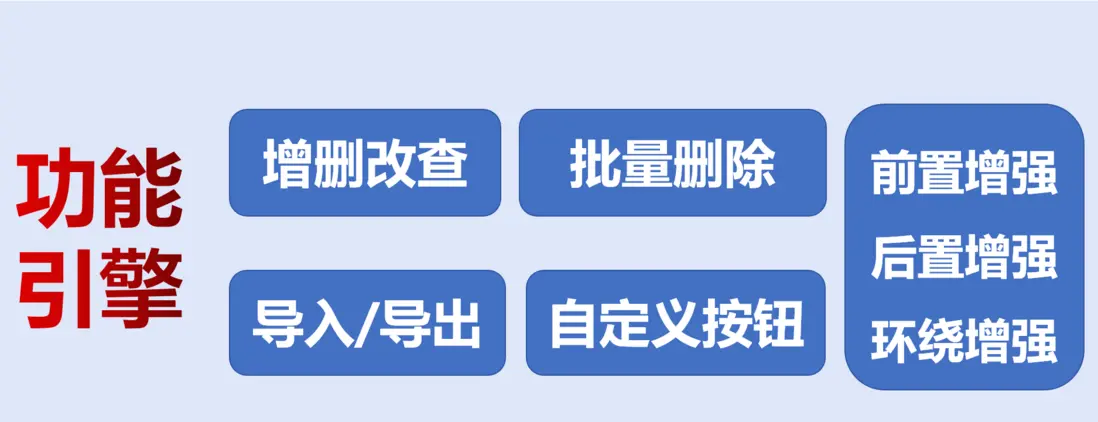 低代碼平台的高效運行,依賴於五大核心引擎,它們共同構建了支撐高性能、可擴展應用開發的底層技術體系。每個引擎承擔不同職責,包括數據處理、功能管理、模板渲染、可視化展示以及系統切面治理,形成完整的工程閉環,使平台既高效又靈活。