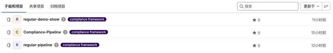 如將此合規框架設置為羣組的默認合規框架,則此羣組下面新建的項目都會默認使用此合規框架,默認運行此合規流水線,而且在項目頁面會有合規框架的標籤生成。